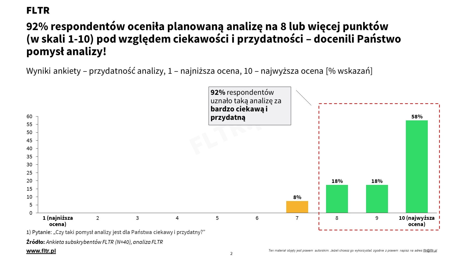Po pierwsze cieszymy się także ogromnym zainteresowaniem naszym pomysłem nowej serii analiz - aż 92% respondentów wskazało, że analiza ta jest bardzo ciekawa i będzie dla nich przydatna. 8% odpowiedzi wskazało na dość wysoką przydatność tej analizy (ocena 7 w skali 1-10). Z tego względu seria ta zagości na łamach FLTR na dłużej i stanie się - obok serii "W górę ,czy w dół" - jedną z czołowych naszych publikacji.
