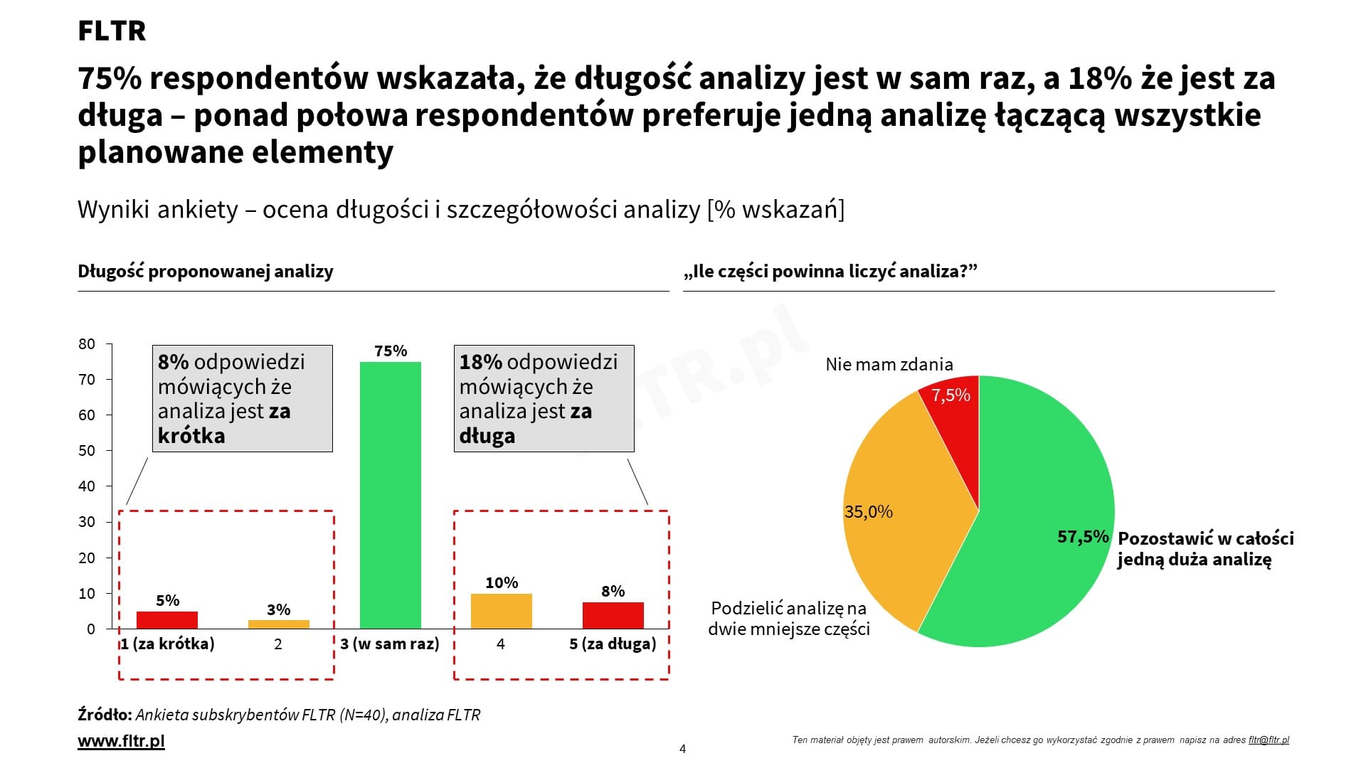 Na bazie Państwa odpowiedzi uznajemy, że zaproponowany przez nas szablon analizy jest co do zasady odpowiedniej długości (75% respondentów), być może nieco za długi (18% respondentów sugerowałaby jego skrócenie). Jednocześnie prawie 60% respondentów sugeruje przygotowanie analizy "za jednym zamachem" - w całości.