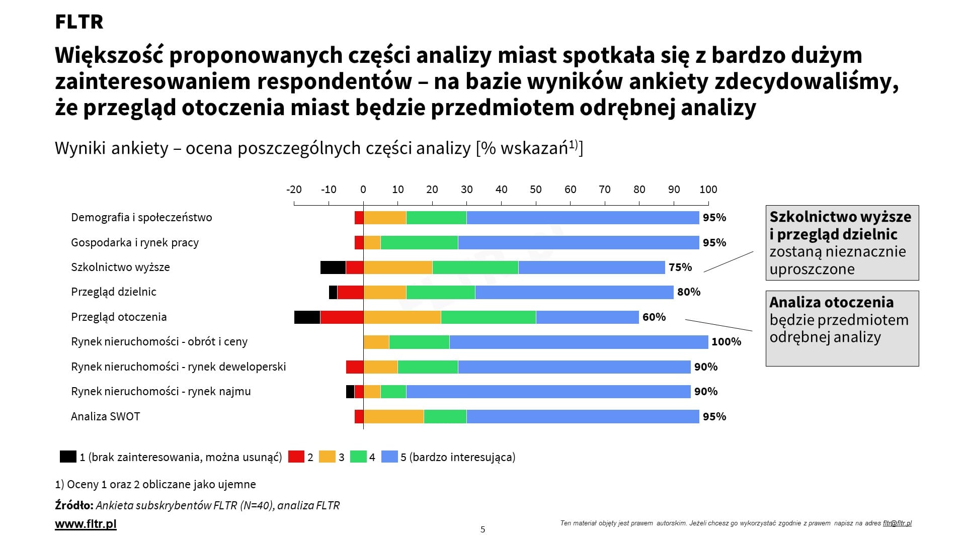 Jednocześnie przy większości proponowanych części analizy wskazali Państwo duże zainteresowanie ich szczegółowym zakresem. Wyjątkiem jest tutaj analiza otoczenia miasta (tj. miasta satelickie, przedmieścia etc.), które otrzymały istotnie więcej ocen braku zainteresowania. Z tego powodu - i sugestii nieznacznego skrócenia całej publikacji - tematyka otoczenia miast zostanie wyłączona z monografii i stanie się przedmiotem odrębnej serii analiz przekrojowych, poświęconych takim obszarom.
