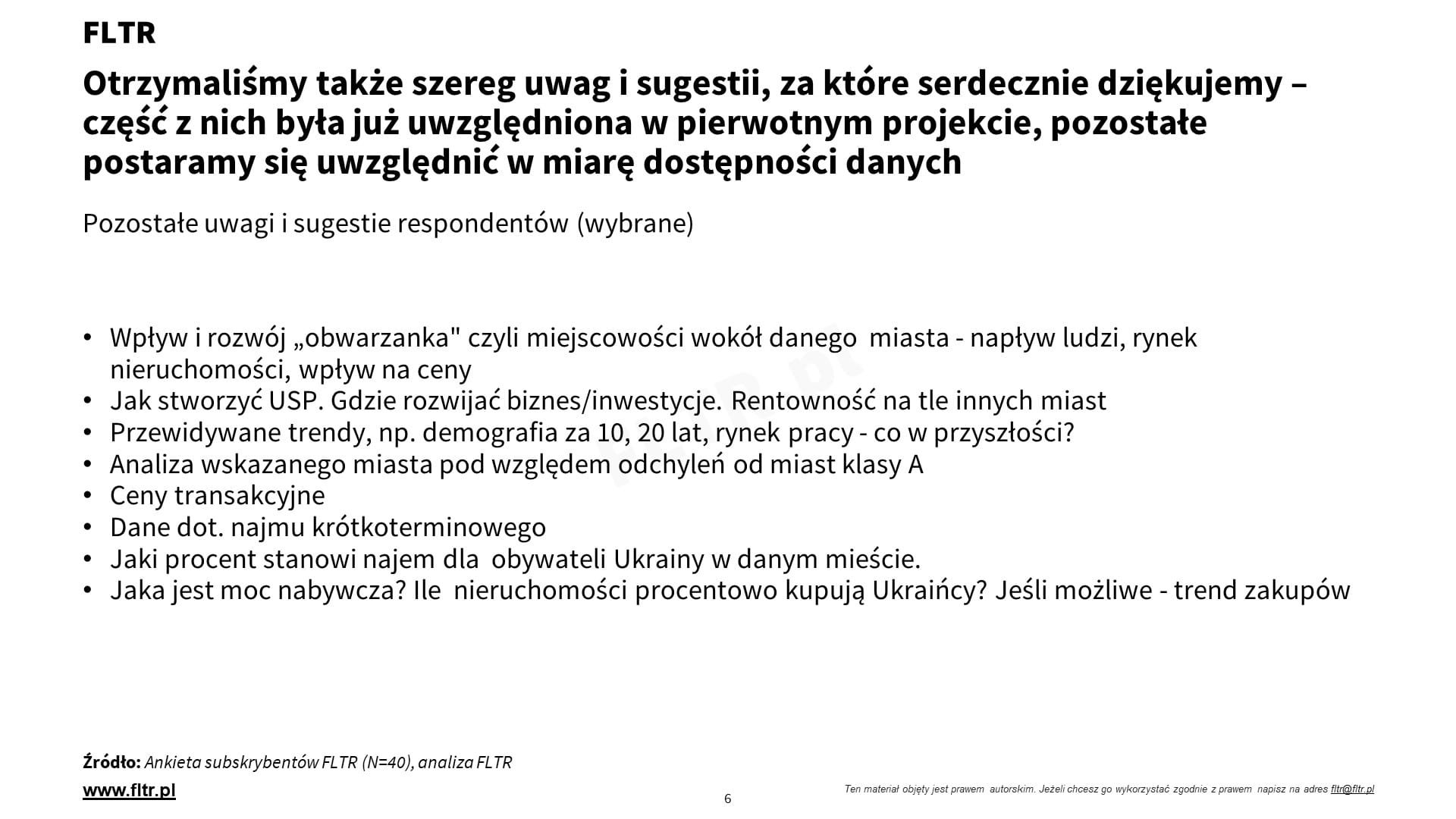 Otrzymaliśmy także szereg innych uwag i sugestii, za które serdecznie dziękujemy! Część z nich była już uwzględniona w pierwotnym projekcie analizy, pozostałe z uwag postaramy się uwzględnić w miarę dostępności danych, wiedzy lub opinii.