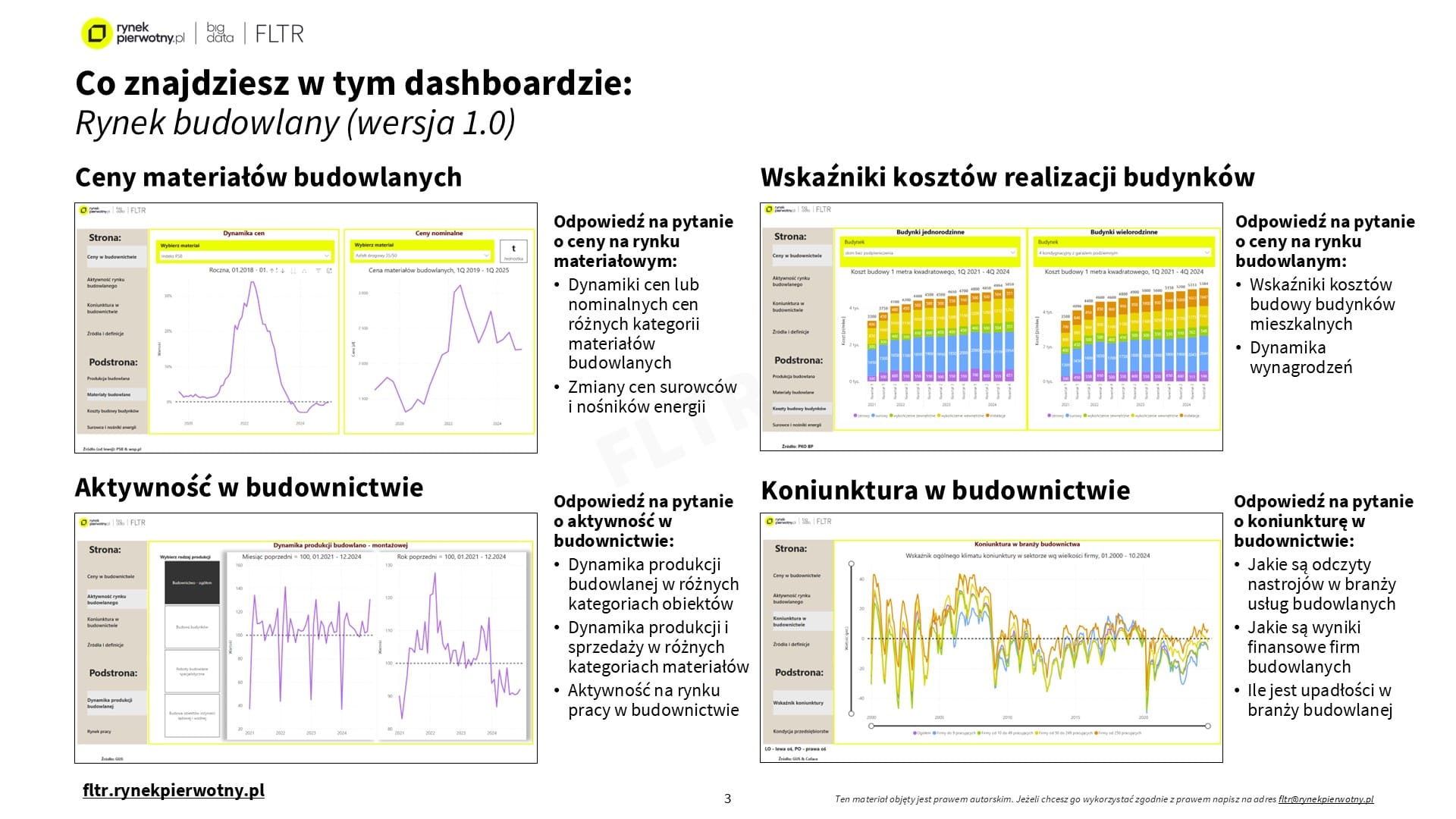 Dashboard analityczny "Rynek budowlany" ma na celu obserwowanie dynamiki cenowej w budownictwie, w tym głównych kategorii materiałów, robót i obiektów. Umożliwia także prognozowanie kosztów budowlanych, monitorowanie aktywności i koniunktury na rynku budowlanym oraz materiałowym. Dodatkowo zapewnia monitorowanie ryzyk eskalacji kosztów oraz kontrolowanie obszarów negocjowania kontraktów budowlanych.