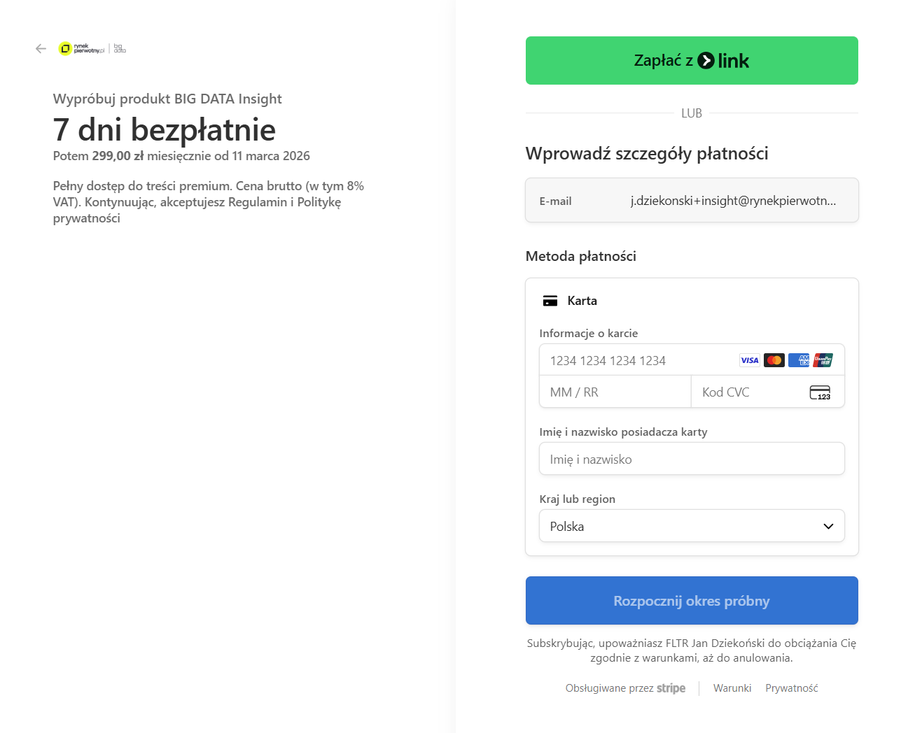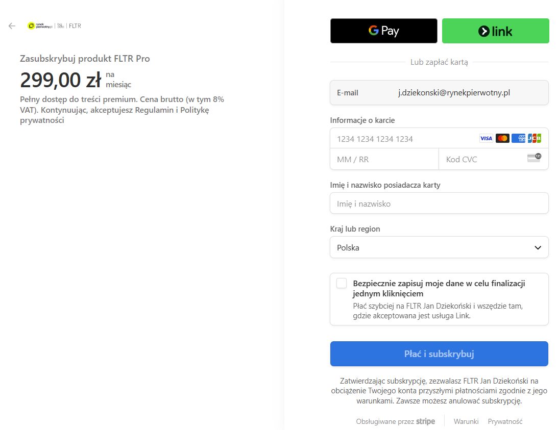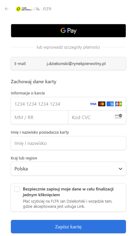 - W kolejnym oknie wybieramy metodę płatności (bezpieczne płatności Stripe, Google Pay, Link) oraz pozostałe dane