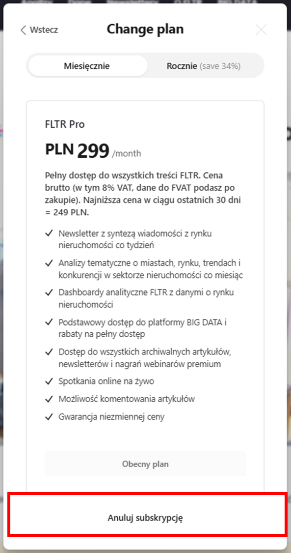 W kolejnym oknie poniżej obecnego planu cenowego pojawi się przycisk Anuluj subskrypcję.