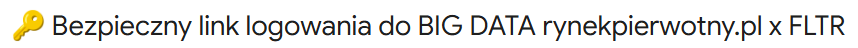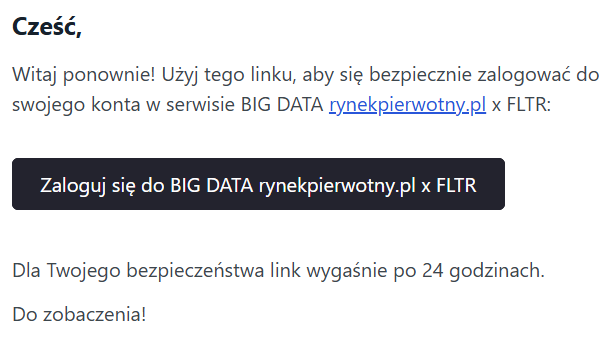 - Na Twój adres email przyjdzie mail z tytułem "Bezpieczny link logowania do BIG DATA rynekpierwotny.pl x FLTR" z domeny rynekpierwotny.pl (fltr@mail.rynekpierwotny.pl przez ghost.io). Mail może wpaść do spamu.