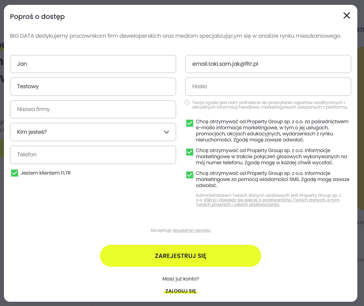 - zarejestrować się na stronie BIG DATA podając identyczny email jak w subskrypcji FLTR z zaznaczeniem pola "Jestem klientem FLTR" i zgód marketingowych.