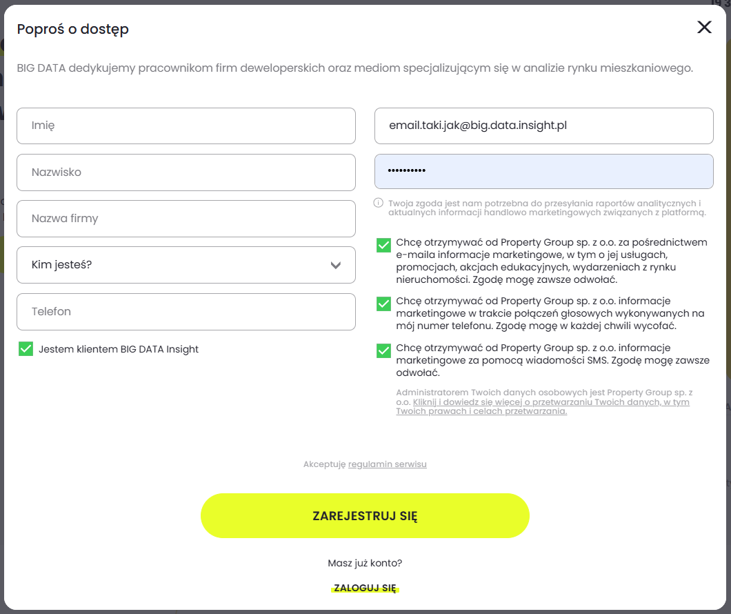 - zarejestrować się na stronie BIG DATA podając identyczny email jak w subskrypcji BIG DATA Insight z zaznaczeniem pola "Jestem klientem BIG DATA Insight" i zgód marketingowych.