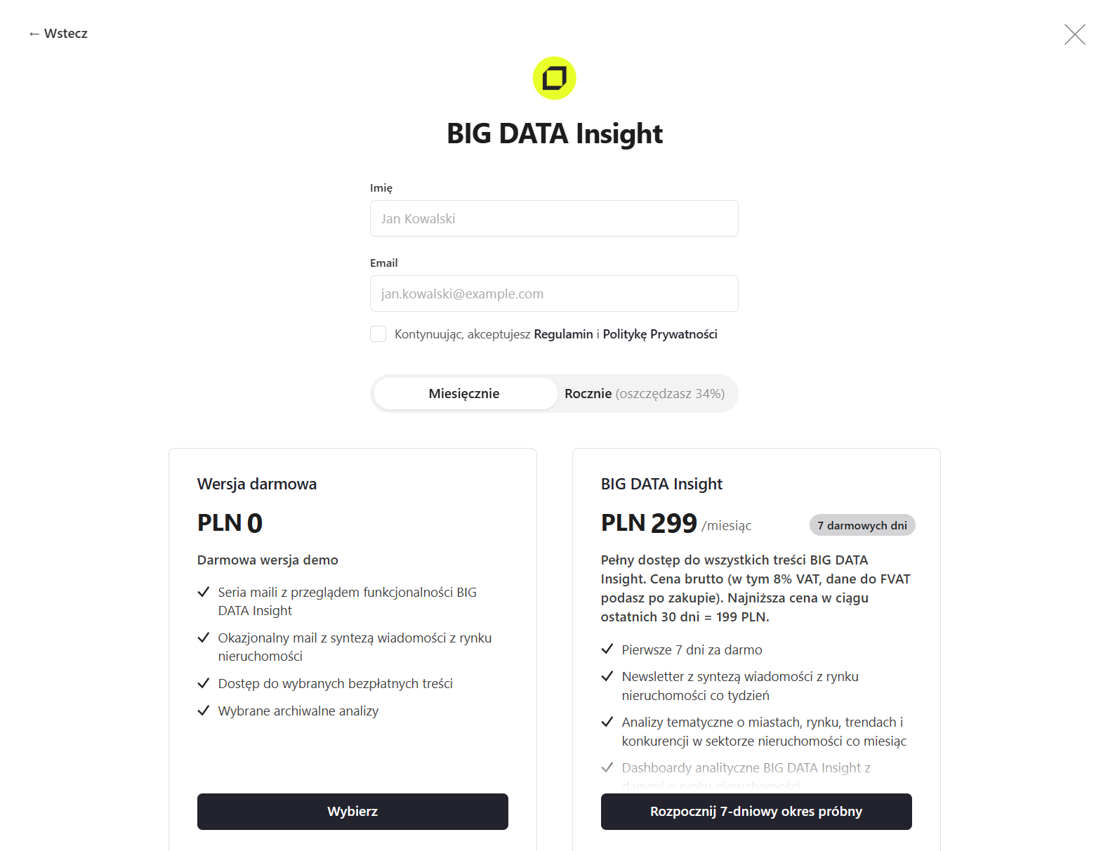 - Podstawowy dostęp oznacza dostęp do strony głównej platformy BIG DATA oraz podsumowań poszczególnych miast. Nie obejmuje szczegółowych podstron obejmujących m.in. szczegółowe wyniki sprzedaży, popytu, wprowadzeń i cen, które są dostępne w wersji pełnopłatnej platformy.