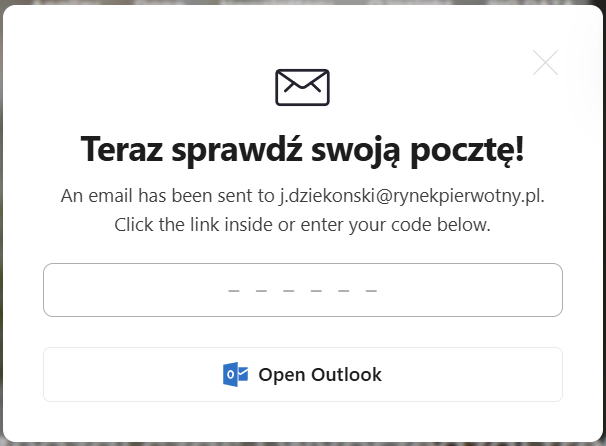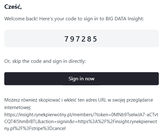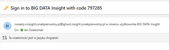 - Na Twój adres email przyjdzie mail z tytułem "Sign in to BIG DATA Insight with code" z domeny rynekpierwotny.pl (insight.rynekpierwotny@ghost.insight.rynekpierwotny.pl). Mail może wpaść do spamu.