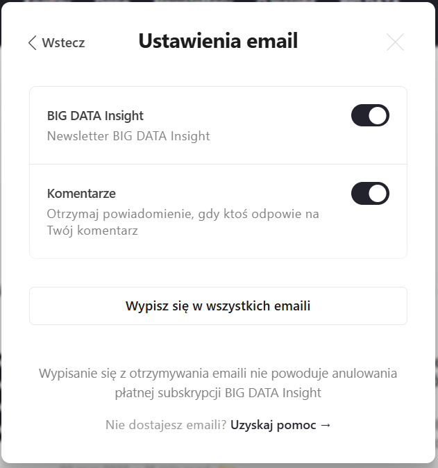A następnie możesz wypisać się z poszczególnych funkcji lub użyć funkcji Wypisz się z wszystkich emaili (UWAGA: to nie powoduje anulowania płatnej subskrypcji - tego dokonasz w powyższej opcji Zmień subskrypcję). Nadal będziesz posiadać dostęp do artykułów: