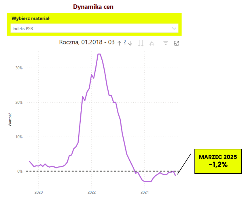 - Dashboard "Rynek budowlany": dane o dynamice cen materiałów budowlanych wg indeksu PSB za marzec 2025 oraz cenach nominalnych materiał budowlanych wg WNP i Intercenbud
