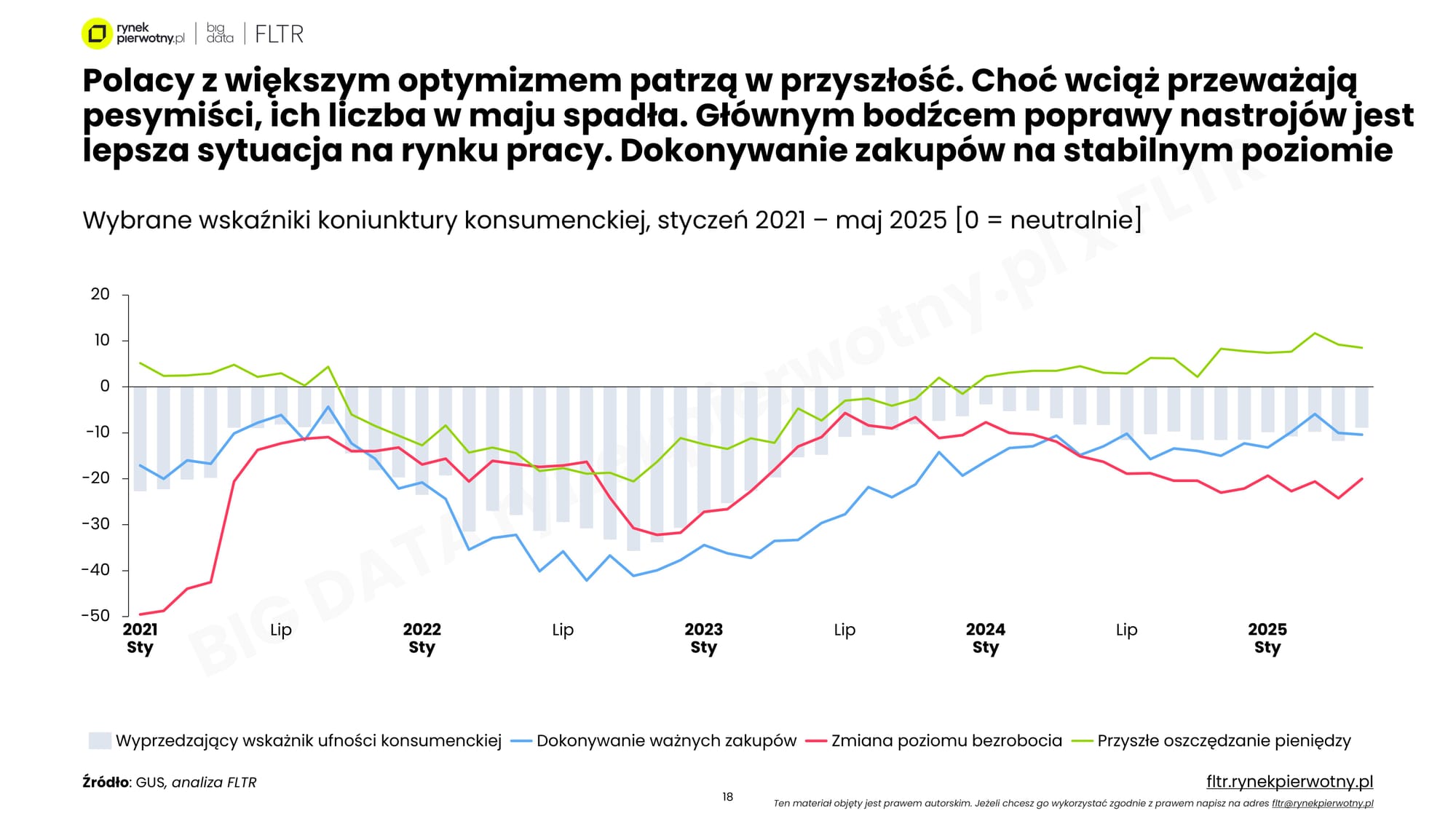 Choć wśród konsumentów wciąż przeważają nastroje pesymistyczne, to maj przyniósł poprawę wskaźników koniunktury po kwietniowym pogorszeniu - w maju wyprzedzający wskaźnik ufności konsumenckiej wzrósł do poziomu -9 punktów (po raz pierwszy od połowy 2024 r.). Przyczyniła się do tego m.in. lepsza ocena sytuacji na rynku pracy i perspektyw gospodarczych kraju, w stagnacji pozostaje nadal dokonywanie ważnych zakupów