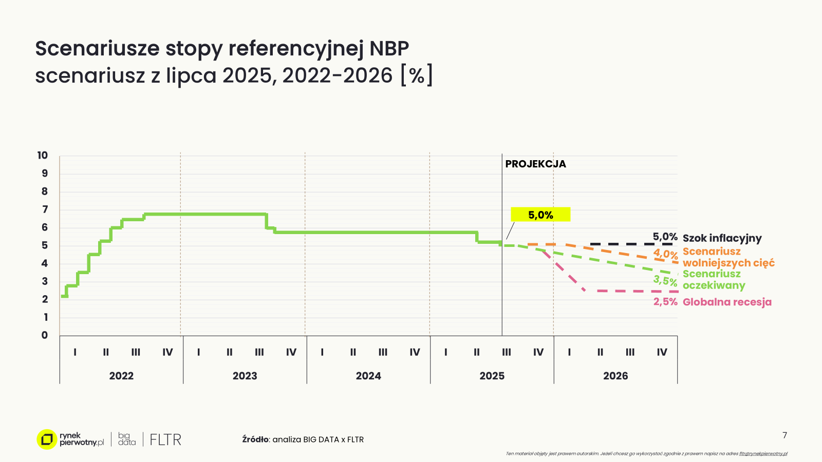Do tej pory analitycy prognozowali przerwę w cyklu obniżek stóp procentowych i ewentualne ich wznowienie na jesień. Jednak na lipcowym posiedzeniu Rada Polityki Pieniężnej podjęła decyzję o obniżeniu stopy referencyjnej o 25 punktów bazowych, do poziomu 5,0%. Czy jest to kontynuacja cyklu obniżek, czy też jednorazowe działanie przekonamy się we wrześniu. Podtrzymujemy obecnie scenariusz stopniowego, ale powolnego obniżania stopy referencyjnej, prawdopodobnie do ok. 4,5% do końca roku i 3,5-4,0% do końca 2026