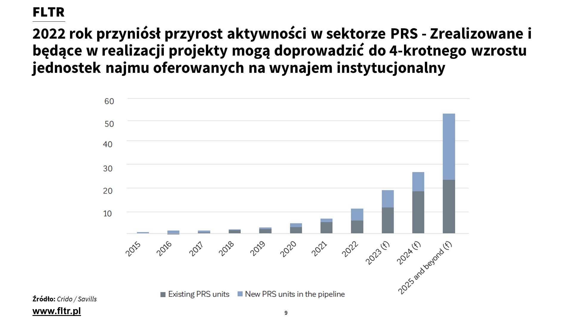 - Jednakże także sektor PRS mierzy się problemami - o ile w poprzednich latach były nimi głównie niedostępność odpowiednich projektów i ograniczona chęć deweloperów do współpracy, to obecnie barierą staje się zwłaszcza obszar finansowania. Ze względu na wysokie koszty finansowania dłużnego w Polsce (o czym pisaliśmy również powyżej), jak i wysoką zmienność polskiej waluty (a więc zwiększony koszt ryzyka dla kapitału zagranicznego) mimo fundamentalnego zapotrzebowania na produkt typu PRS. Było to jedną z prawdopodobnych powodów ograniczenia planów TAG wobec przejętego na początku Robyg - który wg doniesień prasowych ma utrzymać koncentrację na klasycznej działalności deweloperskiej w sektorze mieszkań na sprzedaż.