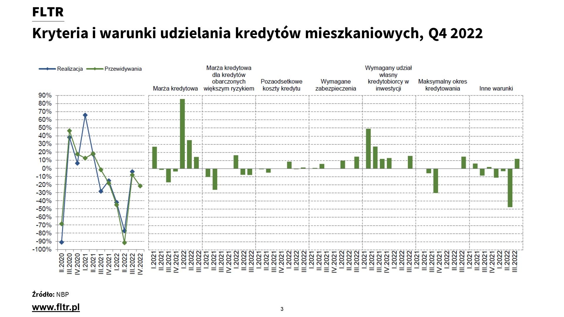 Po rocznym okresie zaostrzania kryteriów udzielania kredytów mieszkaniowych, w III kwartale 2022 r. większość banków nie dokonało zmian uwzględniając w swych decyzjach m.in. spadek popytu i wzrost konkurencji ze strony innych banków. Najczęściej wskazywanym przez banki powodem znacznego spadku popytu na kredyty mieszkaniowe było pogorszenie się sytuacji gospodarstw domowych i prognoz sytuacji na rynku mieszkaniowym.