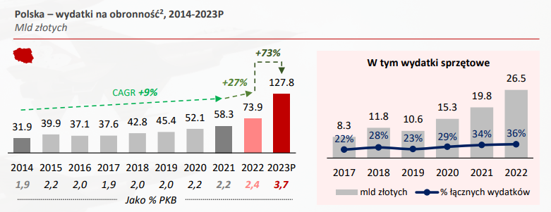 W 2022 r. polskie wydatki na obronność wzrosły o 30% r/r, a w 2023 r. planowano kolejny, imponujący wzrost na poziomie 70%. Pełna realizacja tych planów oznaczałaby, że wydatki na armię stanowiłyby 3,7% PKB - to rekordowy poziom w historii Polski i wyższy niż w jakimkolwiek innym kraju NATO w ostatnim czasie.