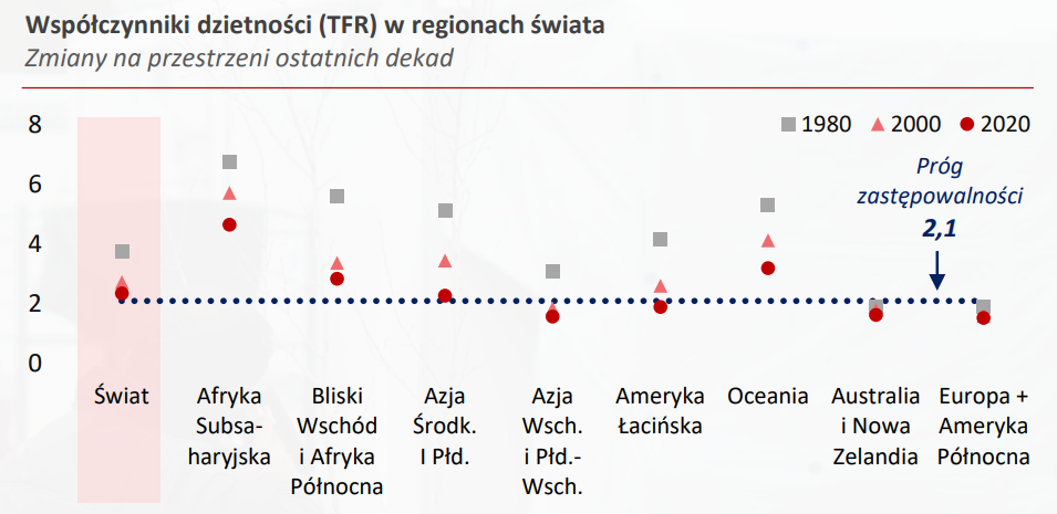 Jednocześnie wzrost populacji światowej zwalnia, a prognozy sugerują, że pod koniec tego wieku może rozpocząć spadki, co spowodowane jest spadkiem dzietności obserwowanym we wszystkich regionach świata - a zwłaszcza w krajach rozwiniętych. Spadek zasobów potencjalnej siły roboczej nastąpi jeszcze przed spadkiem populacji, ponieważ osoby w wieku produkcyjnym stanowią coraz mniejszy odsetek ogółu społeczeństwa. Stąd migracje mogą być konieczne dla utrzymania zasobów na rynku pracy.