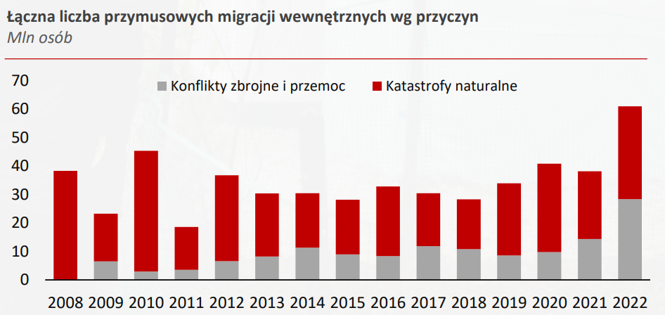 W latach 2008-2022 aż 376 mln ludzi musiało opuścić swoje domy w wyniku katastrof naturalnych i schronić się tymczasowo w innych miejscach na terenie swojego kraju. Dane na temat powrotów są mniej dostępne, szacuje się, że zdecydowana większość tych osób powróciła do swoich domów. Skala migracji wywołanych przez katastrofy naturalne jest niemal trzykrotnie większa niż migracji spowodowanych przez wojny i inne formy przemocy.