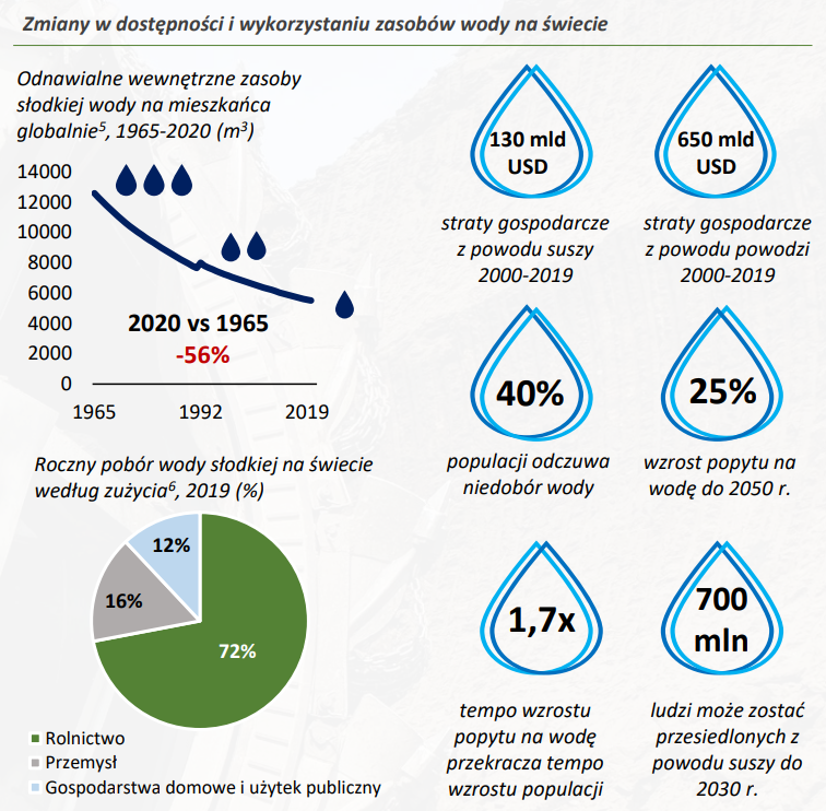 Zmiany klimatu i rosnąca populacja prowadzą do globalnego kryzysu wodnego, a wg danych ONZ, każdy wzrost temperatury o 1°C powoduje spadek zasobów wody pitnej o 20%. Jednocześnie popyt na wodę rośnie szybciej niż populacja, a do 2050 roku może wzrosnąć o 25%. Inwestycje w zrównoważoną gospodarkę wodną są niezbędne, ale kluczowe jest także efektywne zarządzanie wodą i redukcja zanieczyszczeń. Szacuje, że do 2035 r. zużycie wody w energetyce może wzrosnąć o 20%, natomiast rozwój atomu, wodoru i odnawialnych źródeł energii może zaoszczędzić 18 mld m3 wody do 2030 roku.