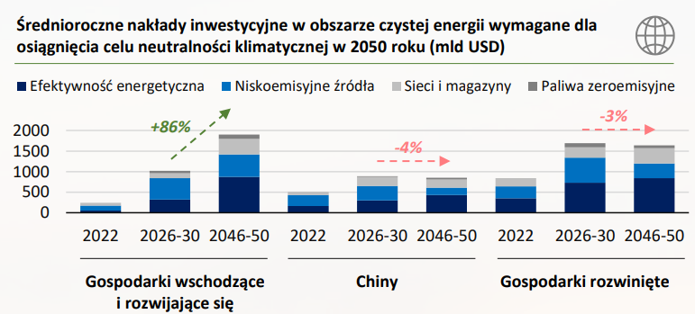 Nakłady na OZE zwiększą się prawie potrójnie, podczas gdy inwestycje w źródła kopalne spadną o ok. 36%. Tempo zmian energetycznych będzie zróżnicowane w różnych krajach - w gospodarkach rozwiniętych i w Chinach szybkie tempo transformacji zostanie osiągnięte już w drugiej połowie obecnej dekad. W przypadku gospodarek wschodzących i rozwijających się obecne nakłady na technologie zeroemisyjne są bardzo niskie, a rozwój w tym obszarze będzie stopniowy, osiągając maksimum dopiero w piątej dekadzie tego stulecia.