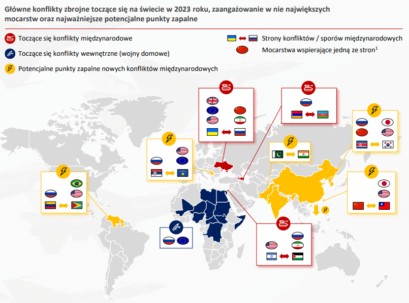 W ostatnich latach obserwuje się coraz większe "rozpychanie się" mocarstw o zasięgu regionalnym (np. agresja Rosji na Ukrainę, zajęcie Górnego Karabachu przez Azerbejdżan, groźby Wenezueli wobec Gujany), a także rosnąca rywalizację między USA a Chinami, potęgującą napięcia na arenie międzynarodowej. Chiny grożąc Tajwanowi, wysuwając roszczenia terytorialne na Morzu Południowochińskim, a USA stara się utrzymać swoją pozycję globalnego lidera, angażując się w konflikty na różnych frontach. Rosja, przechodząc w tryb gospodarki wojennej, szuka sposobów na osłabienie pozycji USA, m.in. poprzez angażowanie się w konflikty na Bałkanach, czy w Afryce. Indie, Brazylia czy Iran, dążą do realizacji własnych interesów, często na przekór interesom globalnym.