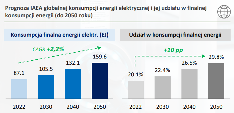 Niemal wszystkie instytucje monitorujące rynek zgodnie twierdzą, że globalne zużycie energii elektrycznej będzie rosnąć - wg prognoz, do 2050 roku może ono wzrosnąć nawet dwukrotnie, a w niektórych scenariuszach nawet trzykrotnie. Na wyższy popyt na energię elektryczną będzie wpływać wiele czynników, m.in. wzrost populacji i postęp technologiczny w różnych dziedzinach. Co ciekawe, w najbardziej optymistycznych scenariuszach, zakładających osiągnięcie pełnej neutralności klimatycznej, przewidywany jest jeszcze silniejszy wzrost zużycia prądu, co potwierdza, że "zielona transformacja" będzie niezwykle "elektrochłonna".