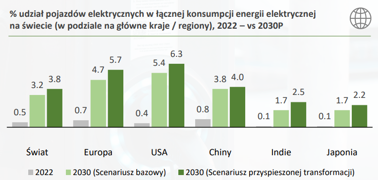 W 2022 r. udział transportu w globalnym zużyciu energii elektrycznej wynosił zaledwie 0,5%, ale szacuje się, że do końca dekady udział ten może wzrosnąć nawet do 3-4%, a w Europie i USA do 5-6%. To oznacza, że elektromobilność będzie jednym z głównych czynników napędzających globalny popyt na energię elektryczną. Według bazowego scenariusza Międzynarodowej Agencji Energii do 2030 r. łączna flota pojazdów elektrycznych wzrośnie na całym świecie 8-krotnie (do ok. 240 mln sztuk vs. 30 mln w 2022 r.), stanowiąc wówczas ponad 10% wszystkich użytkowanych pojazdów.