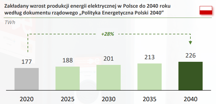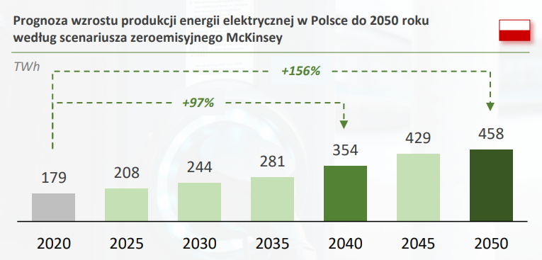 Przyszły wzrost zapotrzebowania na prąd w polskiej gospodarce może być znaczący, jednak zależy od tempa i konsekwencji dążenia do neutralności klimatycznej. Przykładowo, ścieżka wzrostu produkcji energii elektrycznej przewidziana w "Polityce Energetycznej Polski 2040" z 2021 r. jest stosunkowo konserwatywna, zakładając niewielki wzrost. Jednakże scenariusze osiągnięcia statusu zeroemisyjnego do 2050 roku wymagają znacznego zwiększenia produkcji energii elektrycznej, nawet dwukrotnego lub większego, w zależności od analizy, która uwzględnia także elektryfikację procesów przemysłowych i budownictwa.