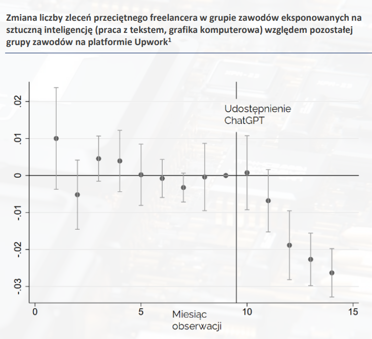 Skutki wprowadzenia generatywnej sztucznej inteligencji na rynek pracy nie są jeszcze widoczne w skali ogólnej, ale zaczynają być dostrzegalne na poszczególnych rynkach. Kilka miesięcy po pojawieniu się ChatGPT, DALL-E czy Midjourney, zaobserwowano spadek liczby zleceń na platformach freelancingowych, np. na popularnym Upworku. Badania przeprowadzone przez ekonomistów Xiang Hui, Orena Reshefa i Luofenga Zhoua obejmujące bardzo dużą grupę freelancerów (92,5 tys. w grupie testowej i 568,6 tys. w grupie kontrolnej) potwierdziły istotność statystyczną tych wyników.