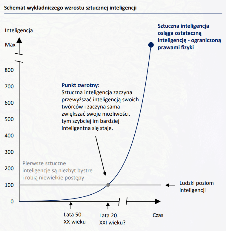 AI będzie wykorzystywać swoją inteligencję do dalszego rozwoju, co prawdopodobnie doprowadzi do wykładniczego wzrostu jej zdolności. W rezultacie, w relatywnie krótkim czasie, osiągnie ona poziom ograniczony jedynie prawami fizyki. Przekroczenie przez AI ludzkiego poziomu inteligencji może mieć rewolucyjne konsekwencje, przestaniemy wówczas rozumieć AI i jej wynalazki, takie jak postęp naukowy i nowe technologie. Co więcej, utracimy kontrolę nad sztuczną inteligencją, ponieważ będzie w stanie nas przechytrzyć.