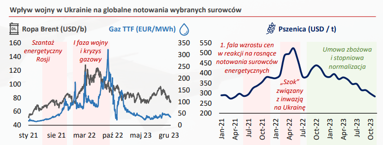 Jednym z głównych kanałów wpływu wojny na gospodarkę są surowce, czego przykład stanowi szantaż energetyczny Rosji poprzez ograniczanie dostaw gazu do Europy (gwałtowny wzrost cen notowań w całym kompleksie energetycznym). Rozpoczęcie inwazji Rosji na Ukrainę w lutym 2022 roku pogłębiło kryzys gazowy i spowodowało gwałtowny wzrost cen surowców roślinnych, których Rosja i Ukraina są kluczowymi eksporterami.