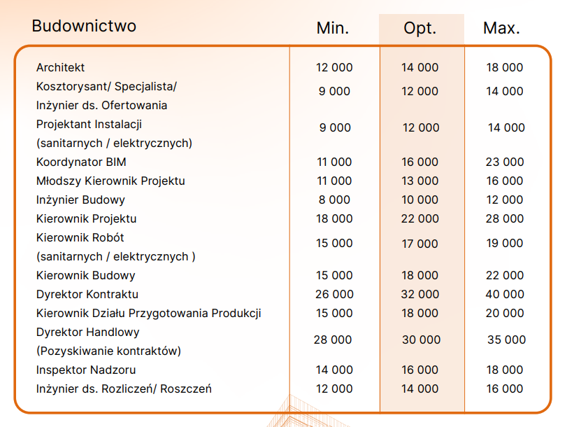 Rok 2024 będzie dla branży budowlanej czasem budowania portfela zamówień, co wiązać się będzie z poszukiwaniem kadry do działań przetargowych, ofertowania i pozyskiwania inwestycji. Nadal obserwowany będzie wzrost zainteresowania specjalistami w dziedzinie nowych, energooszczędnych technologii, zielonej energii oraz ESG. Niezmiennie poszukiwani będą kierownicy robót branżowych, szczególnie elektrycznych i sanitarnych, a także doświadczeni kierownicy kontraktów do nadzoru dużych inwestycji przemysłowych.