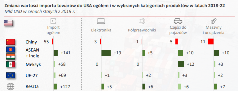 USA jest najbardziej wyraźnym przykładem relokacji źródeł dostaw wśród państw zachodnich. Od rozpoczęcia "wojny handlowej" z Chinami w 2018 r., import z tego kraju do USA spadł o 10% (w cenach stałych). Dotyczy to również strategicznych produktów, takich jak półprzewodniki czy maszyny i urządzenia, gdzie spadek wyniósł około 1/3.