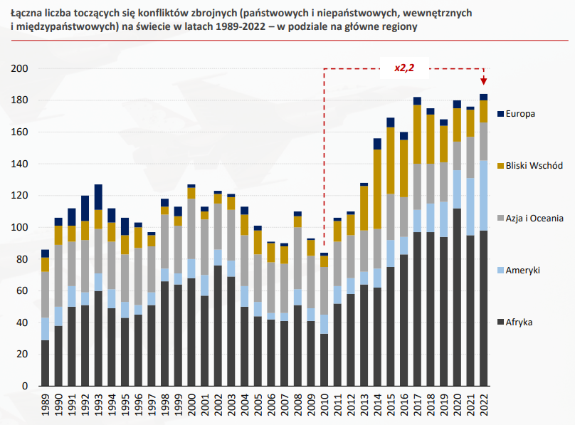 W roku 2022 odnotowano rekordową liczbę konfliktów zbrojnych od zakończenia II wojny światowej (184 konflikty). Zdecydowana większość z nich miała charakter wewnętrzny, a około 45% nie angażowało państw. Szczególnie niepokojące jest angażowanie się w "domowe" konflikty, co często ma na celu jedynie umocnienie ich wpływów w danych regionach (np. w Afryce).