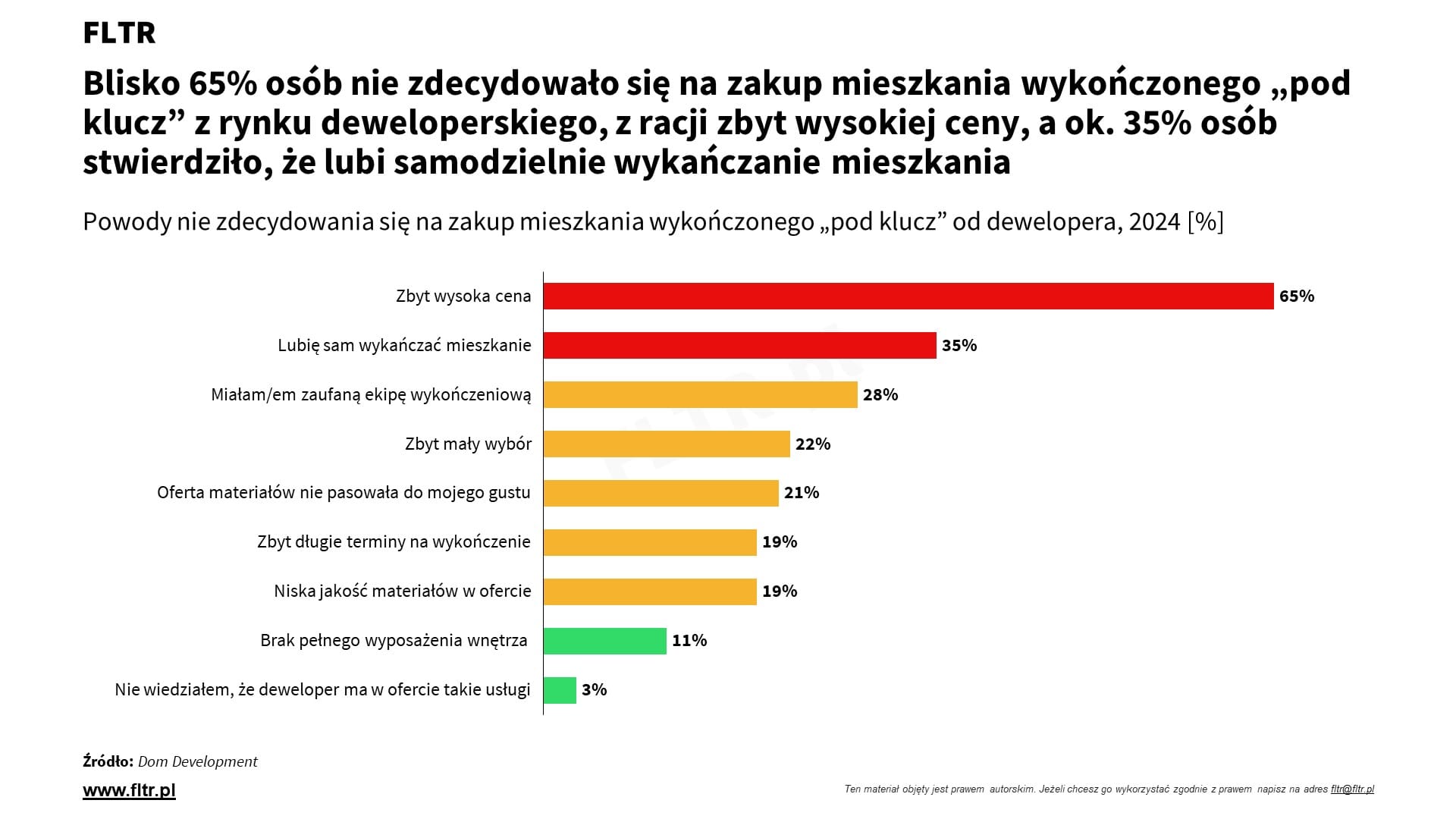 - Wyniki badania pokazują, że ok. 65% ankietowanych nie zdecydowało się na zakup wykończonego mieszkania od dewelopera ze względu na zbyt wysoką cenę, z kolei 35% osób stwierdziło, że lubi samodzielnie przeprowadzać prace wykończeniowe