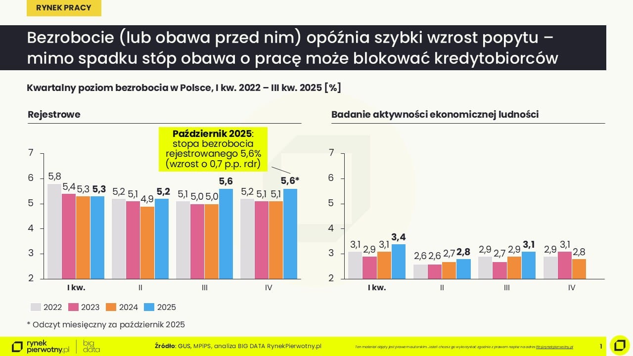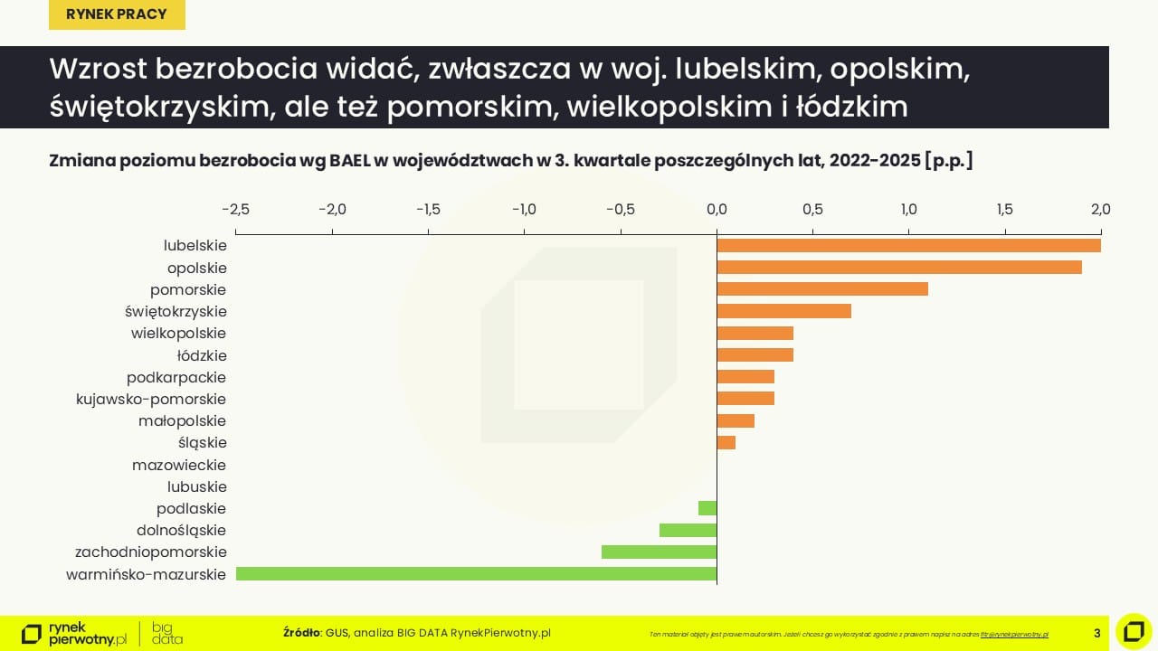 Bezrobocie nadal rośnie. GUS opublikował dane o aktywności ekonomicznej ludności (tzw. BAEL) za III kwartał 2025. Badanie to analizuje bezrobocie wśród osób, które faktycznie poszukują pracy. Ogólne bezrobocie BAEL pozostanie Bezrobocie mierzone tą metodologią pozostaje niskie (3,1% w III kwartale), ale stanowi to wyraźny wzrost wobec poprzednich lat. Bezrobocie rośnie w szczególności w grupach "first-time buyers" (do 34 lat) oraz w kilku województwach (zwłaszcza lubuskie, opolskie, świętokrzyskie, ale też silne gospodarczo województwa wielkopolskie, łódzkie i pomorskie).