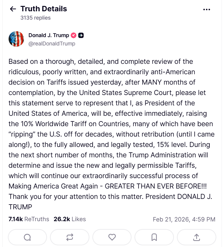 Sąd Najwyższy uznał politykę celną prowadzoną przez Donalda Trumpa i nałożone przez niego taryfy na towary z większości krajów Świata, za niezgodne z prawem. Oznacza to, że firmy objęte opłatami mogą dochodzić zwrotu poniesionych kosztów. Prezydent USA w "ramach odpowiedzi" na nieprzechylny wyrok, zapowiedział globalną stawkę celną 15% (powołując się na odmienną podstawę prawną, niż ta która została zakwestionowana przez sąd)