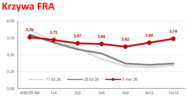 Na marcowym posiedzeniu, Rada Polityki Pieniężnej postanowiła obniżyć stopę procentową o 0,25 p.p. tym samym stopa referencyjna wynosi dzisiaj 3,75%. Jeszcze przed eskalacją wojny na Bliskim Wschodzie zakładano scenariusz zejścia do poziomu 3,25-3,5%, RPP zachowała jednak bardziej zachowawczą postawę. Dzisiaj rynek wycenia, że taki poziom stopy pozostanie z nami na dłużej, lub ew. nastąpi niewielkie jej obniżenie