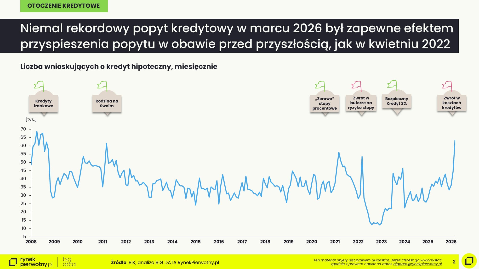 W marcu 2026 r. do banków zgłosiło się 63,3 tys. wnioskujących o kredyt hipoteczny. Nominalnie większe zainteresowanie hipotekami było tylko w 2008 r. Powodem tak wysokiej akcji mogło być przyśpieszenie decyzji podjętych przez potencjalnych kredytobiorców, którzy chcieli zdążyć złożyć wniosek jeszcze na niższym oprocentowaniu jakie obowiązywało w marcu - zarówno po stronie nowych kupujących, jak i refinansujących kredyty