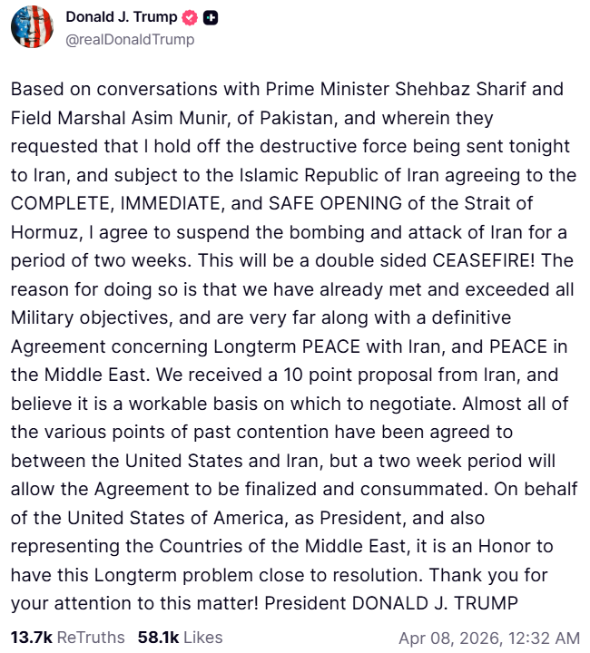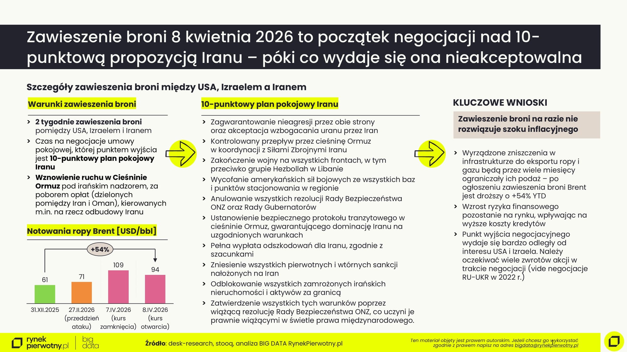 🕊️ Zawieszenie broni w Zatoce Perskiej na 2 tygodnie - złamane już po 24 godzinach 🚀 W nocy z 7 na 8 kwietnia 2026 zawarto rozejm pomiędzy USA, Izraelem i Iranem na okres dwóch tygodni, podczas których prowadzone będą negocjacje 10-punktowego planu pokojowego autorstwa Iranu (patrz grafika 👇). Rozejm zakładał wstrzymanie działań wojennych, a także otwarcie Cieśniny Ormuz dla ruchu morskiego pod nadzorem Iranu. Rynki finansowe z euforią przyjęły tę informację, podnosząc notowania indeksów od 2-7% zależnie od rynku. Wzrosły też notowania obligacji i spadły ceny ropy oraz gazu, choć nadal są o ponad 50% powyżej notowań z początku roku. Jednak w ciągu pierwszych 24 godzin zgłoszono różne naruszenia porozumienia, a także ponownie zamknięto Cieśninę. Stawiamy tu kilka wniosków: