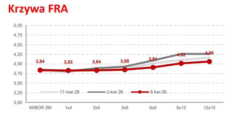 W kwietniu 2026 Rada Polityki Pieniężnej zdecydowała utrzymać stopy na niezmienionym poziomie, tym samym stopa referencyjna wynosi 3,75%. Jeszcze przed eskalacją wojny na Bliskim Wschodzie zakładano scenariusz zejścia do poziomu 3,25-3,5%. Dzisiaj rynek wycenia, że taki poziom stopy utrzyma się dłużej, a nawet w przypadku zaostrzenia sytuacji możliwe są jej podwyżki