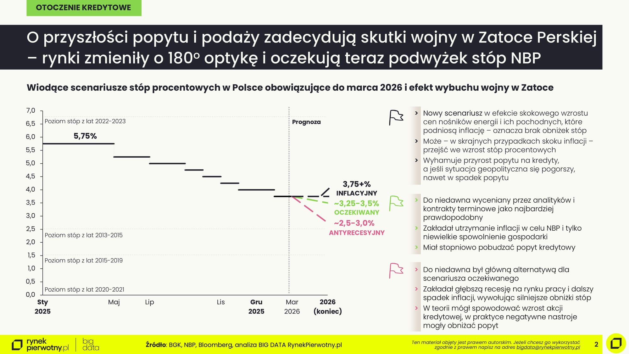 🪙 Stopy procentowe bez zmian - w grze skrajne scenariusze Zgodnie z oczekiwaniami rynkowymi i naszym inflacyjnym scenariuszem stóp procentowych NBP na 2026 rok, Rada Polityki Pieniężnej 9 kwietnia 2026 pozostawiła stopy procentowe Narodowy Bank Polski (NBP) bez zmian. O ile jeszcze półtora miesiąca temu konsensus rynku wskazywał na przestrzeń na 1-2 obniżki (a bardziej pesymistyczni oczekiwali nawet większych cięć), to obecny konsensus ekspertów i rynków finansowych wskazuje na albo utrzymanie stóp bez zmian (eksperci, członkowie RPP), albo przestrzeń do 1-2 podwyżek (stawki FRA). Z perspektywy kredytobiorców to dwie informacje:
