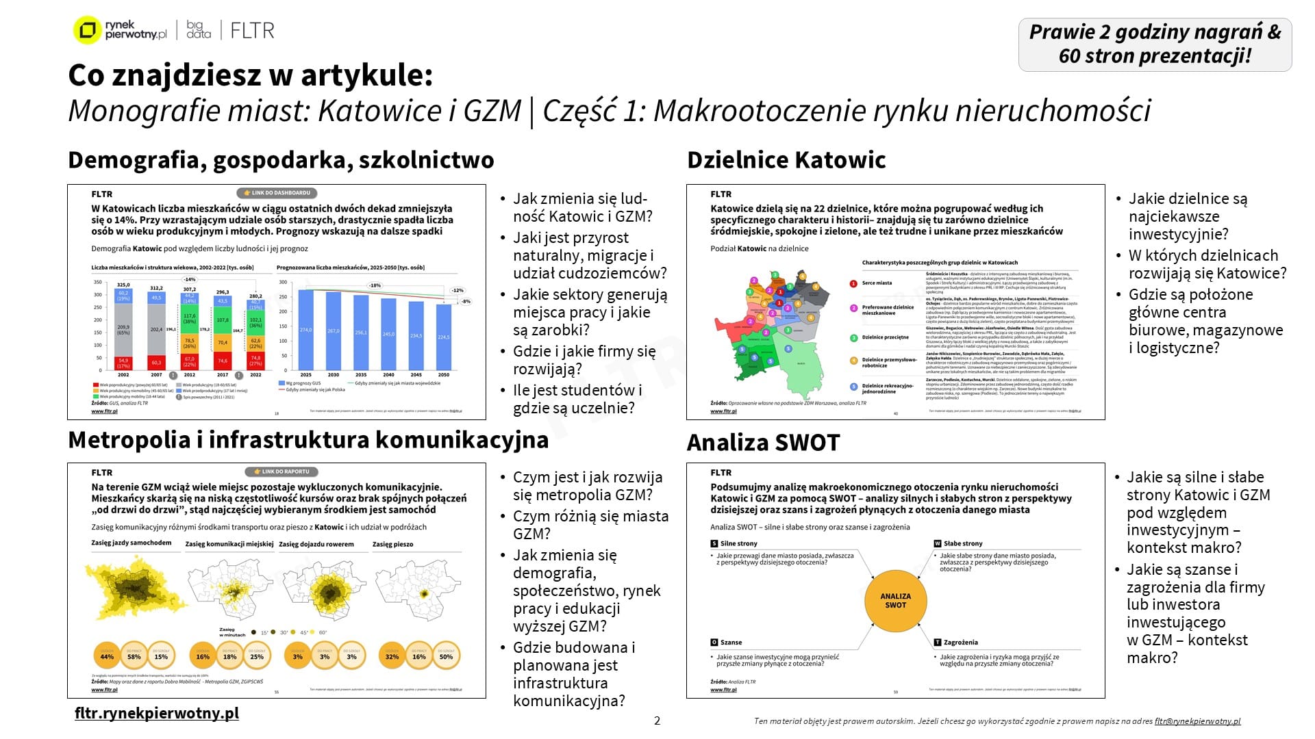 Poniższa seria analiz FLTR wprowadza cały cykl monografii poświęconych analizie poszczególnych miast wojewódzkich Polski. W ramach serii przedstawiona zostaje: demografia, gospodarka i rynek pracy oraz szkolnictwo. W drugiej kolejności zaprezentowany zostaje rynek nieruchomości, który jest przedstawiony w 3 podrozdziałach: aktywność budowlana i rynek deweloperski, obrót i ceny nieruchomości oraz rynek najmu i PRS. Następnie dokonywany jest przegląd dzielnic i osiedli. Każda część serii kończy się analizą SWOT danego miasta, opisującą jego słabe i mocne strony oraz potencjalne szanse i zagrożenia w perspektywie inwestycyjnej.