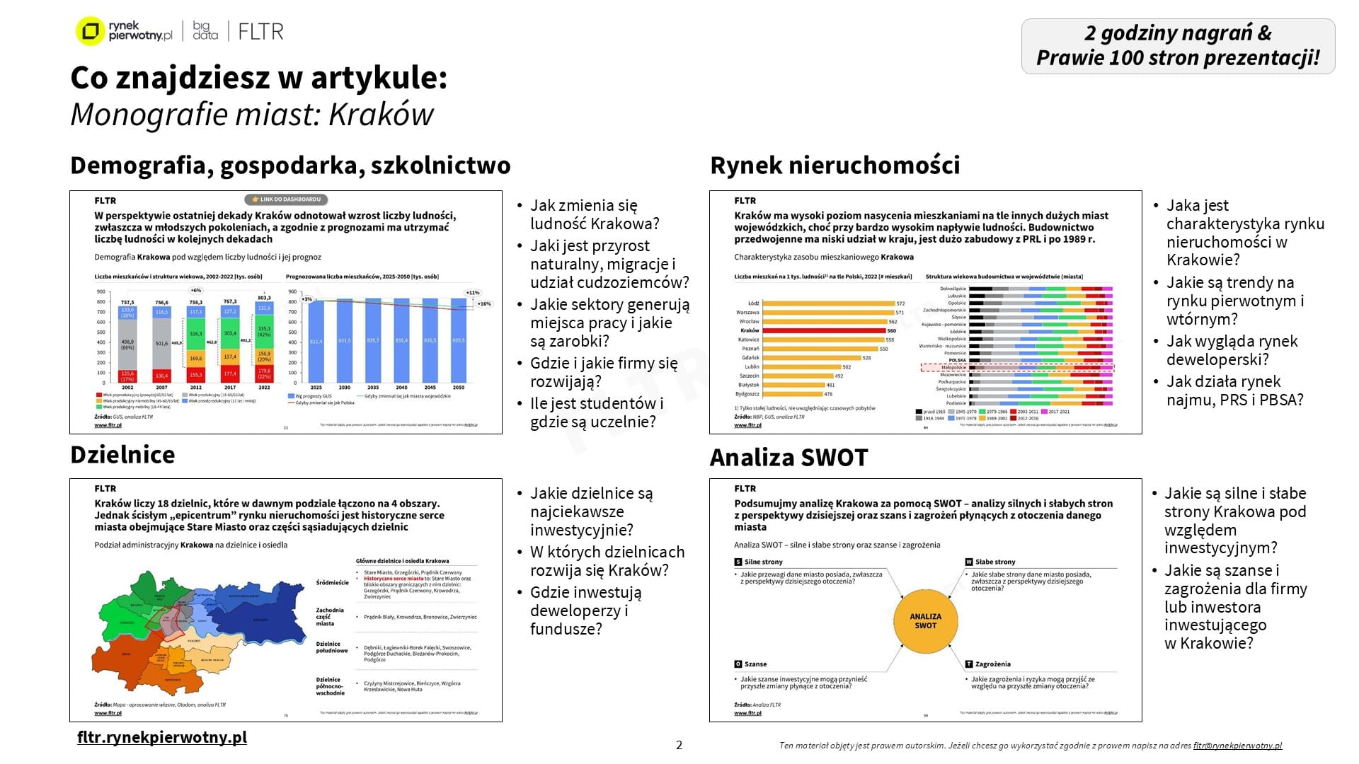 Poniższa seria analiz FLTR wprowadza cały cykl monografii poświęconych analizie poszczególnych miast wojewódzkich Polski. W ramach serii przedstawiona zostaje: demografia, gospodarka i rynek pracy oraz szkolnictwo. W drugiej kolejności zaprezentowany zostaje rynek nieruchomości, który jest przedstawiony w 3 podrozdziałach: aktywność budowlana i rynek deweloperski, obrót i ceny nieruchomości oraz rynek najmu i PRS. Następnie dokonywany jest przegląd dzielnic i osiedli. Każda część serii kończy się analizą SWOT danego miasta, opisującą jego słabe i mocne strony oraz potencjalne szanse i zagrożenia w perspektywie inwestycyjnej.