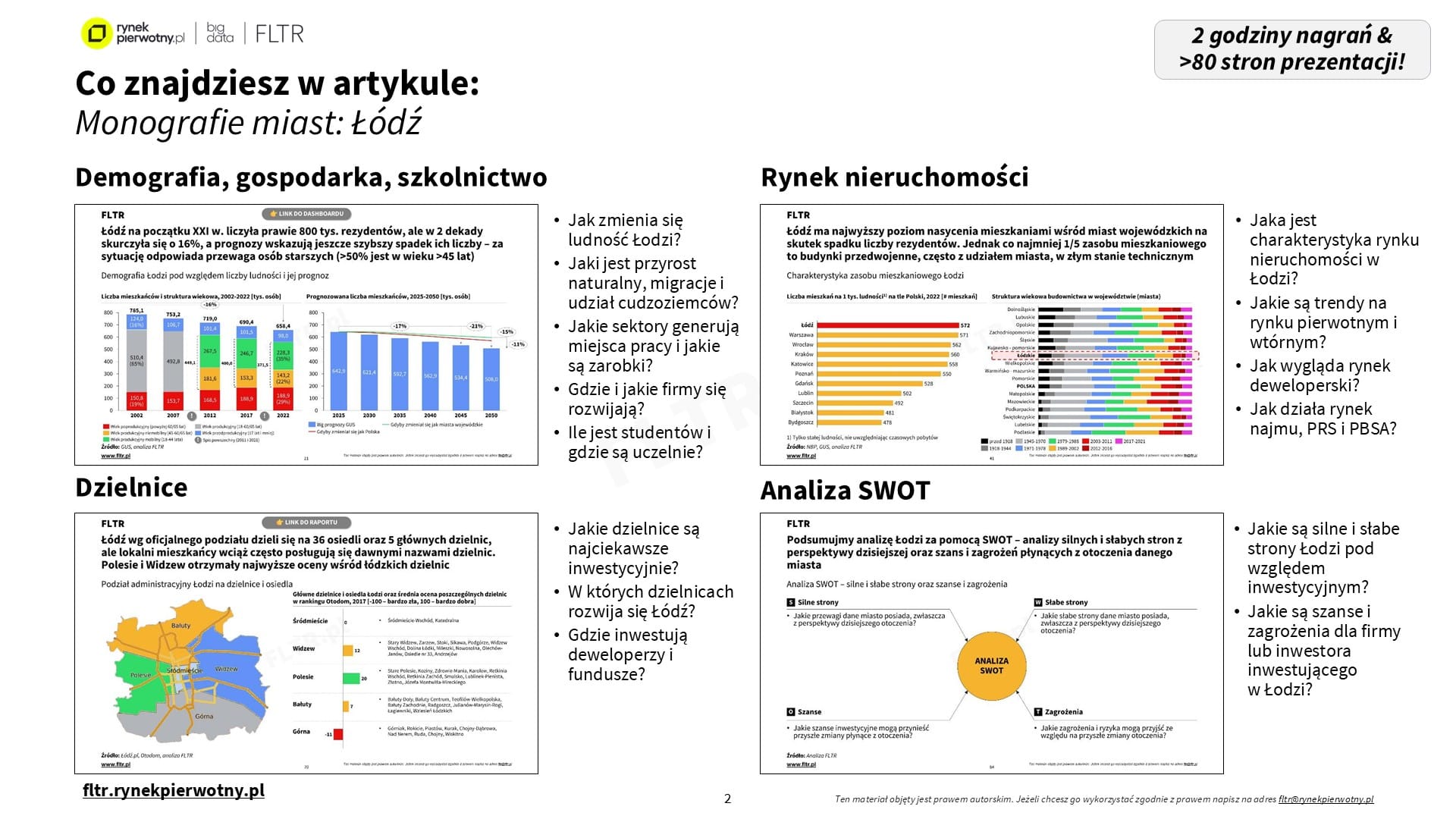 Poniższa seria analiz FLTR wprowadza cały cykl monografii poświęconych analizie poszczególnych miast wojewódzkich Polski. W ramach serii przedstawiona zostaje: demografia, gospodarka i rynek pracy oraz szkolnictwo. W drugiej kolejności zaprezentowany zostaje rynek nieruchomości, który jest przedstawiony w 3 podrozdziałach: aktywność budowlana i rynek deweloperski, obrót i ceny nieruchomości oraz rynek najmu i PRS. Następnie dokonywany jest przegląd dzielnic i osiedli. Każda część serii kończy się analizą SWOT danego miasta, opisującą jego słabe i mocne strony oraz potencjalne szanse i zagrożenia w perspektywie inwestycyjnej.