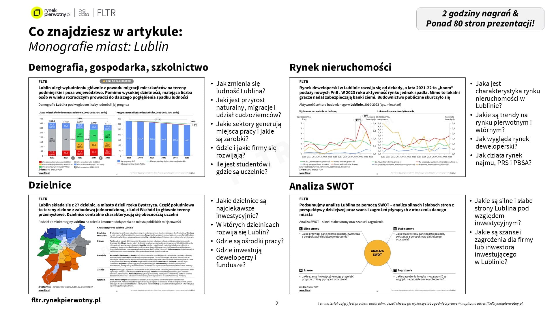 Lublin, jako silny ośrodek akademicki i administracyjny, wyróżnia się rosnącą aglomeracją oraz stabilnym sektorem publicznym, który zapewnia bezpieczeństwo zatrudnienia. Wysoka jakość życia, dobra infrastruktura drogowa i sprzyjający inwestycjom Urząd Miasta przyciągają inwestorów, a wysokie czynsze najmu generują atrakcyjne stopy zwrotu. Jednak miasto zmaga się z wysokim bezrobociem, spadkiem liczby ludności samego miasta i słabo rozwiniętym sektorem nowoczesnych usług. Brak transportu szynowego, percepcja miasta "Ściany Wschodniej", wysokie bezrobocie i niskie wynagrodzenia oraz ograniczona dostępność cenowa mieszkań z rynku pierwotnego mogą też hamować jego rozwój. Miasto ma jednak szansę na wzrost dzięki licznym inwestycjom publicznym i potencjalnemu utworzeniu Stałej Bazy Lotnictwa Wojskowego. Jego przyszłość zależy od zdolności do przyciągania nowych inwestycji i przełamania wizerunku miasta mniej atrakcyjnego dla biznesu.