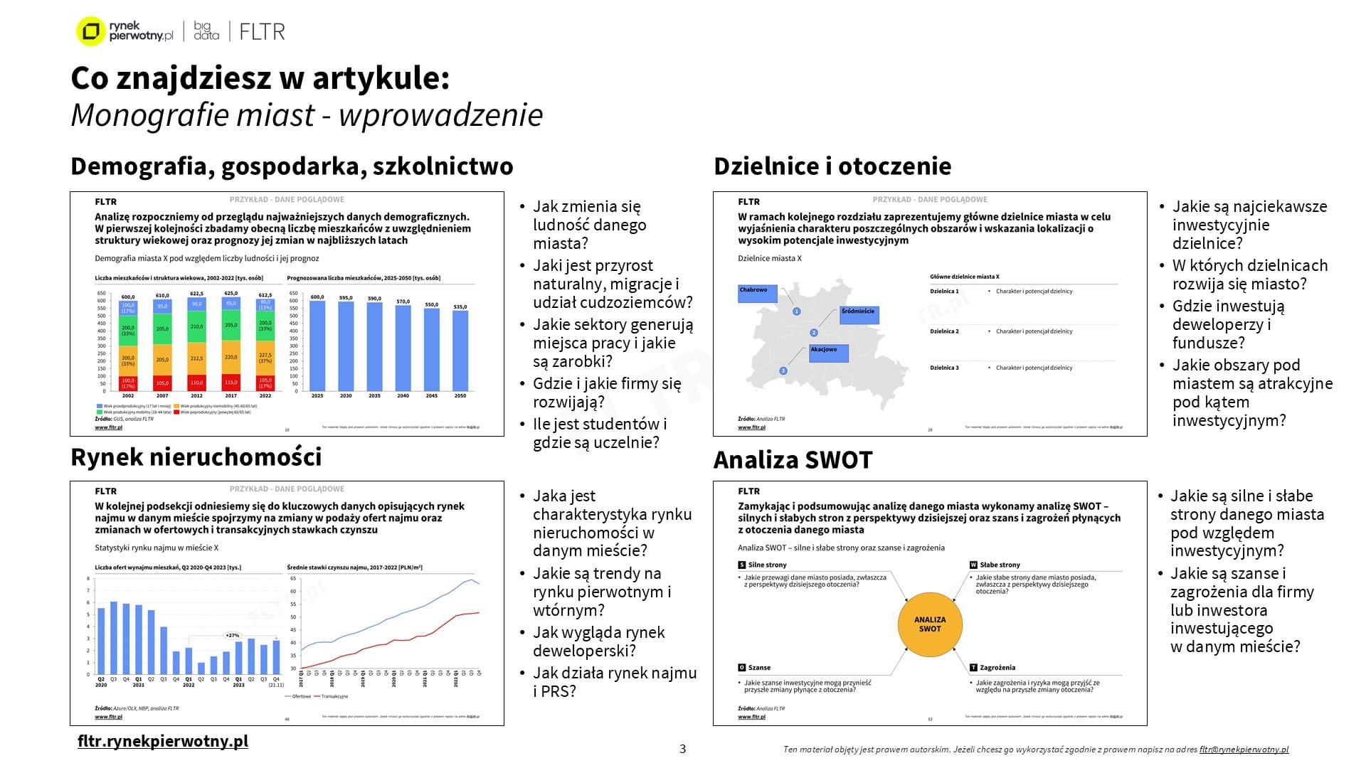 Na sam koniec ka偶dej analizy przeprowadzona zostanie analiza SWOT danego miasta, opisuj膮ca jego s艂abe i mocne strony oraz potencjalne szanse i zagro偶enia w perspektywie inwestycyjnej.