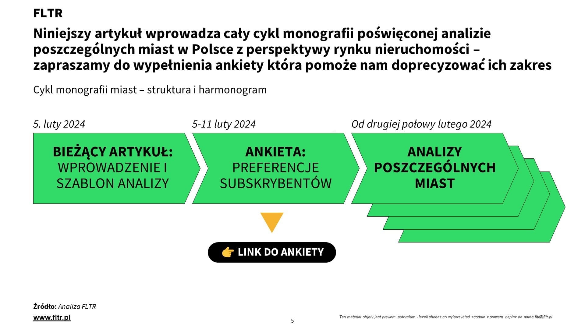 Poni偶szy artyku艂, nagranie i prezentacja maj膮 charakter wprowadzaj膮cy - zosta艂y stworzony dla przedstawienia Subskrybentom FLTR proponowanego przez nas zakresu analizy. Chcieliby艣my uzyska膰 od Pa艅stwa informacj臋 zwrotn膮 - czy proponowany zakres jest interesuj膮cy, jak膮 przyj膮膰 kolejno艣膰 analizowanych miast, a tak偶e czy wprowadzi膰 ewentualne zmian w planowanej analizie. Poprosimy Pa艅stwa o przekazanie opinii za pomoc膮 ankiety do dnia 11. lutego 2024. Umo偶liwi nam to rozpocz臋cie analiz poszczeg贸lnych miast od drugiej po艂owy lutego. Ankieta zosta艂a zako艅czona - poznaj jej wyniki!