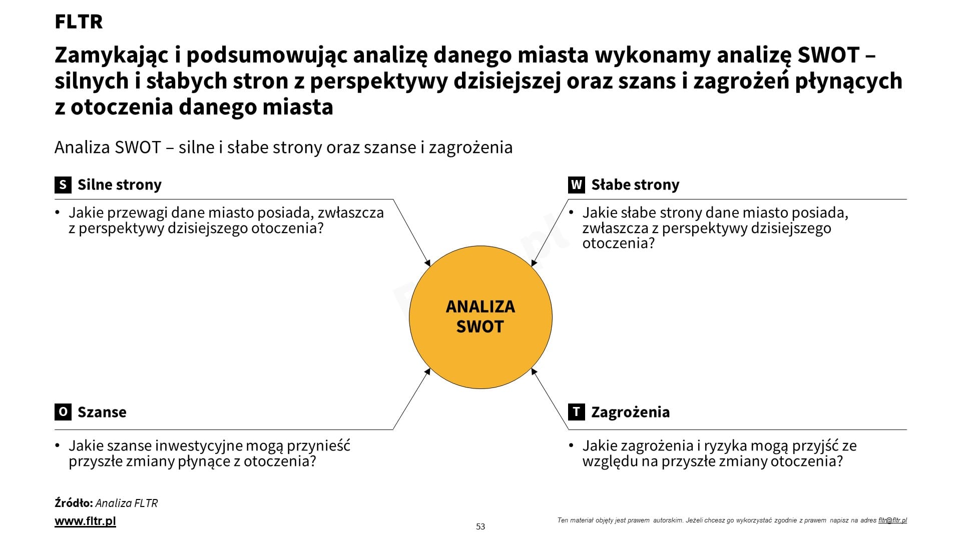 Na sam koniec ka偶dej analizy przeprowadzona zostanie analiza SWOT danego miasta, opisuj膮ca jego s艂abe i mocne strony oraz potencjalne szanse i zagro偶enia w perspektywie inwestycyjnej.