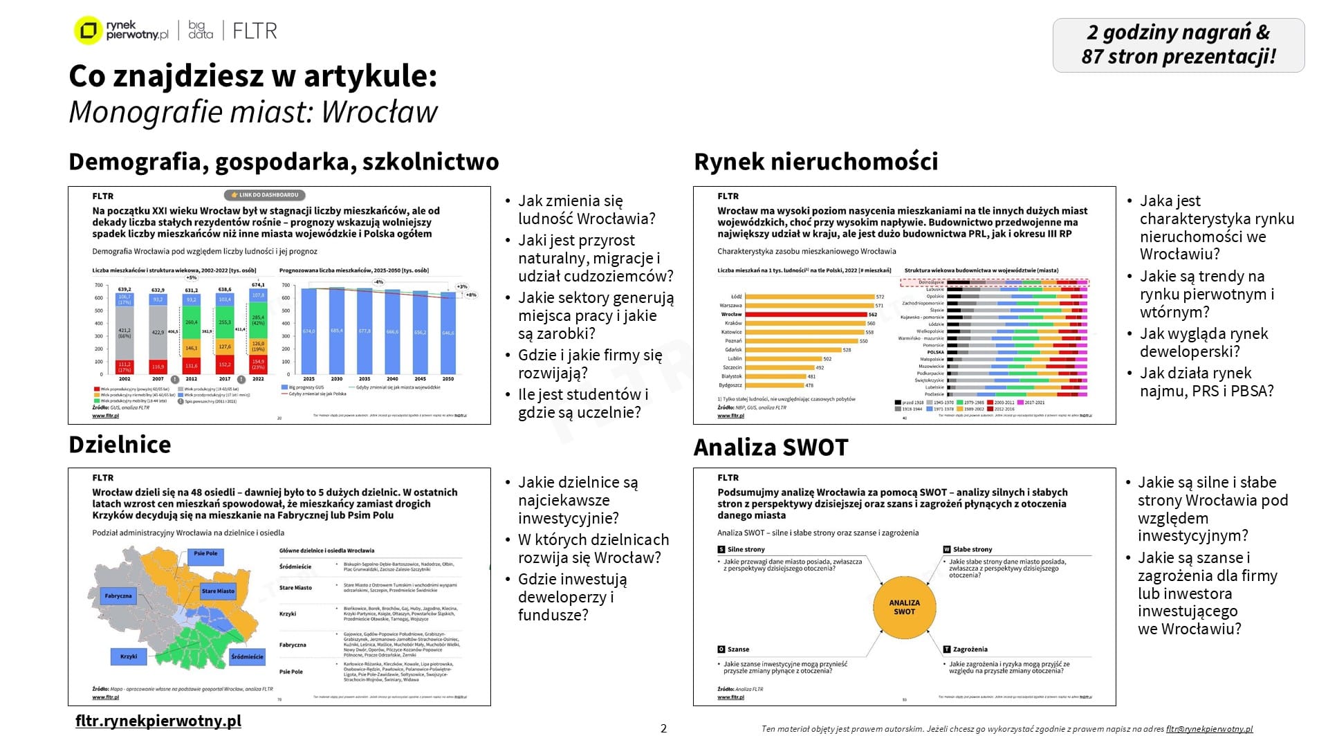 Poniższa seria analiz FLTR wprowadza cały cykl monografii poświęconych analizie poszczególnych miast wojewódzkich Polski. W ramach serii przedstawiona zostaje: demografia, gospodarka i rynek pracy oraz szkolnictwo. W drugiej kolejności zaprezentowany zostaje rynek nieruchomości, który jest przedstawiony w 3 podrozdziałach: aktywność budowlana i rynek deweloperski, obrót i ceny nieruchomości oraz rynek najmu i PRS. Następnie dokonywany jest przegląd dzielnic i osiedli danego miasta. Każda część serii kończy się analizą SWOT danego miasta, opisującą jego słabe i mocne strony oraz potencjalne szanse i zagrożenia w perspektywie inwestycyjnej.