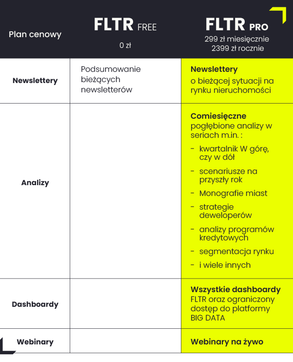Newsletter i pozostałe funkcjonalności FLTR jest skierowany tylko i wyłącznie do jego Subskrybentów - w wersji płatnej w dwóch planach cenowych - płatnym FLTR Pro lub bezpłatnym FLTR Free. Poniższa grafika prezentuje zakres funkcjonalny wszystkich planów cenowych FLTR: